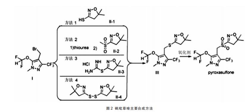 從有關(guān)文獻(xiàn)報(bào)道,砜吡草唑合成方法主要有4種(見圖2)。
